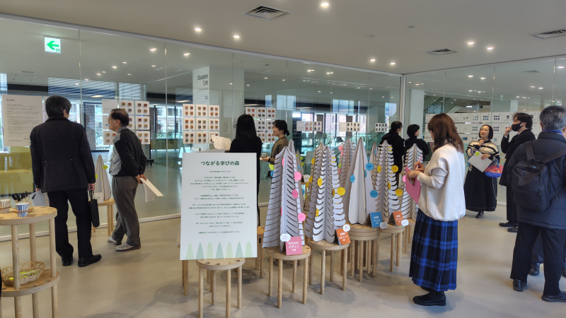 学生一人ひとりの学びの軌跡を3色の糸で可視化した「Itomoji Plate」展示や、来場者自身が「好きなこと」「得意なこと」などを書き込んで参加できる《つながる学びの森》など、見る・考える・参加することを大切にした構成。「Itomoji Plate」は3色が混沌とまじりあったものや、ほぼ一色に見えるものなど、一人ひとりの学びの個性が一目で感じ取れます。