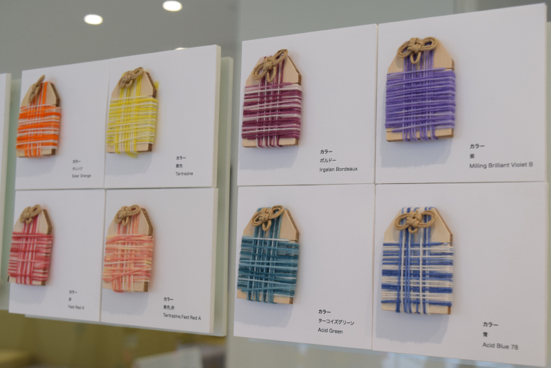 「おまもりチャーム」づくりはオープンキャンパスで高校生に大人気だったワークショップです。廃材の板や糸を使い、酸性染料で糸を染め、廃材の板に巻き付けてお守りにします。藍染めの「藍」について探究した結果をイラストで表現した展示は、学びの広がりと深みを感じさせます。